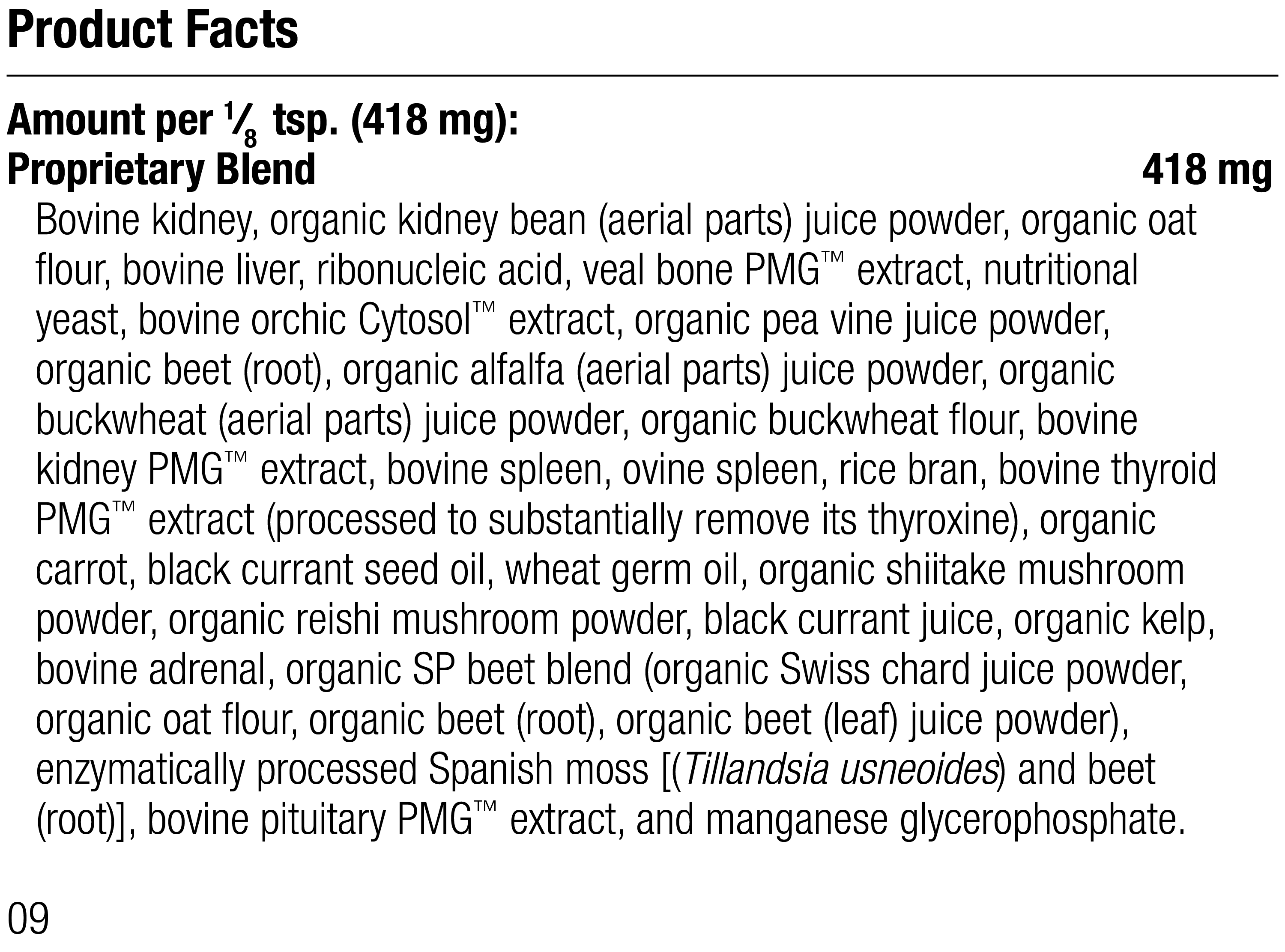 Bovine kidney, organic kidney bean (aerial parts) juice powder, organic oat flour, bovine liver, ribonucleic acid, veal bone PMG™ extract, nutritional yeast, bovine orchic Cytosol™ extract, organic pea vine juice powder, organic beet (root), organic alfalfa (aerial parts) juice powder, organic buckwheat (aerial parts) juice powder, organic buckwheat flour, bovine kidney PMG™ extract, bovine spleen, ovine spleen, rice bran, bovine thyroid PMG™ extract (processed to substantially remove its thyroxine), organic carrot, black currant seed oil, wheat germ oil, organic shiitake mushroom powder, organic reishi mushroom powder, black currant juice, organic kelp, bovine adrenal, organic SP beet blend (organic Swiss chard juice powder, organic oat flour, organic beet (root), organic beet (leaf) juice powder),  enzymatically processed Spanish moss [(Tillandsia usneoides) and beet (root)], bovine pituitary PMG™ extract, and manganese glycerophosphate.