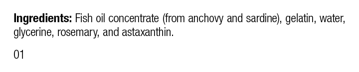 Each Serving Size (1 Softgel) contains: Ingredients: Fish oil concentrate (from anchovy and sardine), gelatin, water, glycerine, rosemary, and astaxanthin.